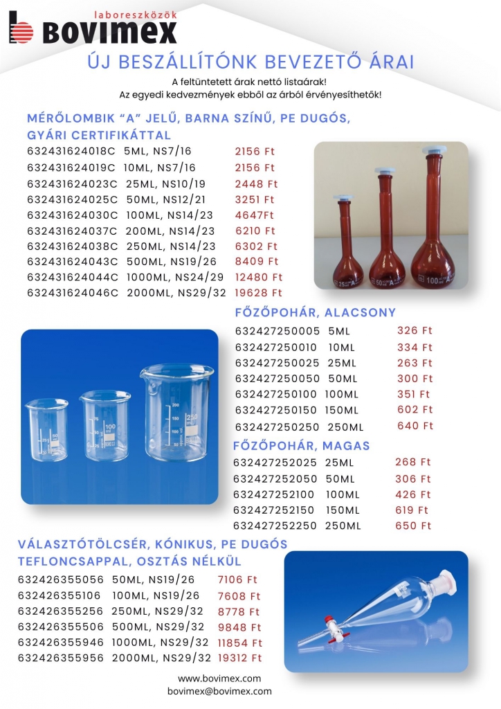 Technosklo főzőpoharak, barna mérőlombik, választótölcsér