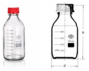szögletes, osztással, ISO csavarmenettel, csavaros PP kupakkal és PP kiöntőgyűrűvel, boroszilikát üveg